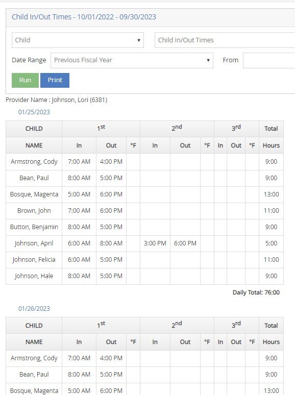 Child In/Out Times - This report will show you each day selected in the date range and each participants in/out times. The report will show on the screen, but can also ne printed using the blue Print button.