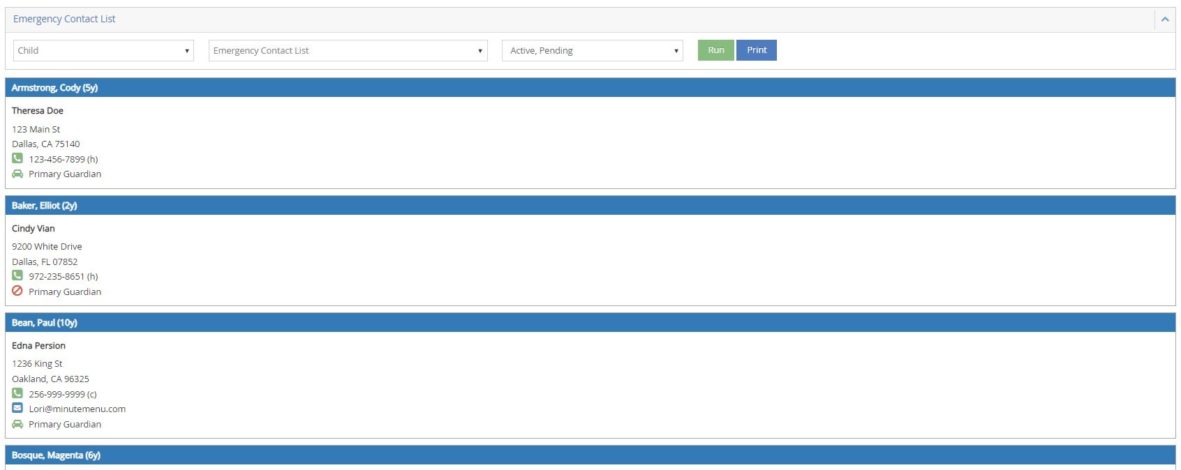 Emergency Contact List - This report is only available for those who subscribe to KidKare Accounting. The report will show on the screen, but can also ne printed using the blue Print button.