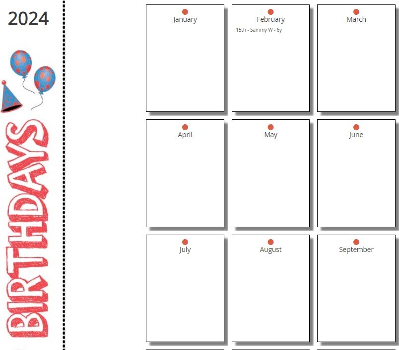 Birthday Calendar - This is a printable yearly calendar with participant birthday listed under the appropriate month. The report will show on the screen, but can also ne printed using the blue Print button.