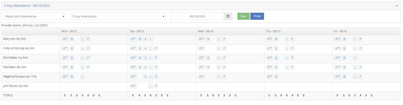 5 Day Attendance - When pulling this report, select the date of the LAST day you want to view. If you select 6/16m the report will pull the data from 6/16 PLUS the 4 days prior to the 16th that have data. This report shows you 5 consecutive days work of attendance and meal counts by child. This may need to be pulled for your monitor or state team if you are being reviewed. You can view this report on the screen, or print it by clicking the blue Print button.