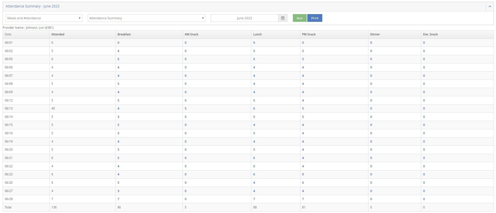 Attendance Summary - This report gives a view of every day and the total attendance and meals served for each meal type for the month selected. You can view this report on the screen, or print it by clicking the blue Print button.