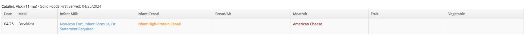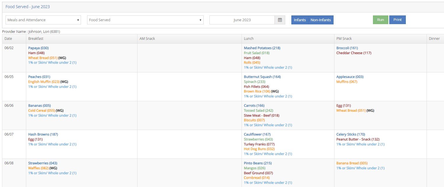 Infant Feeding Details - This report shows each infant and which components they were served for each meal. You can view this report on the screen, or print it by clicking the blue Print button.