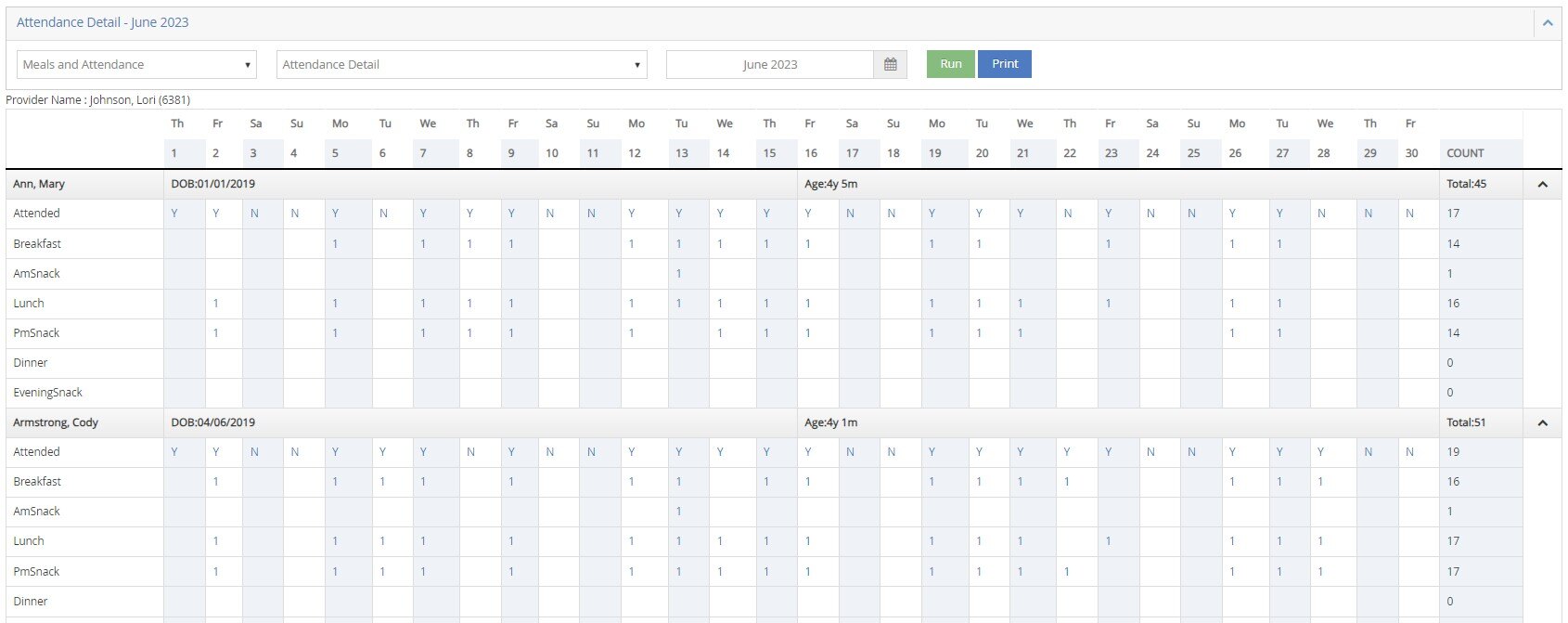 Claimed Attendance Detail - This report shows every day of the month, child name and details (dob & age), each meal they were in attendance for and total attendance and meals served for the month.