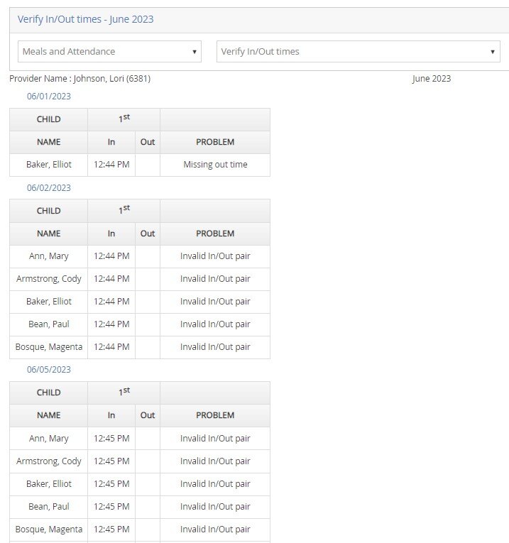 Verify In/Out Times - Use the Verify In/Out Times report to review participant in/out times for a specific month. You can view this report on the screen, or print it by clicking the blue Print button.